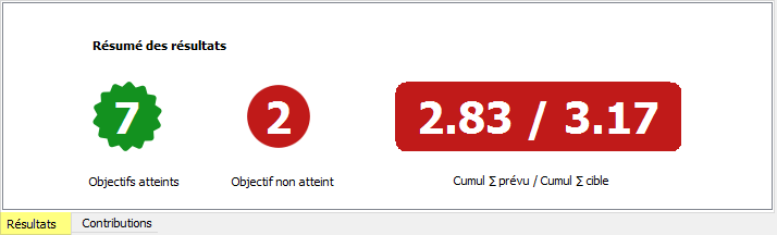 Le volet Résultat se trouve en bas du panneau d'analyse de la tolérance. Lorsqu'il existe plusieurs chaînes de cotes, mais qu'aucune n'est sélectionnée, le volet de résultats affiche un résumé du nombre d'objectifs atteints ou non et une analyse de qualité cumulative qui utilise l'indicateur de qualité choisi et spécifié dans les paramètres.