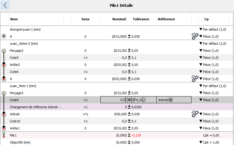 - Résultats : résultats de l'analyse de la chaîne de cotes selon le niveau de qualité cible défini. Les résultats sont présentés au même format que celui utilisé pour la définition des objectifs (±, +/-, Limites, etc.).