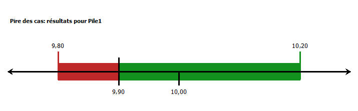 Les nombres qui apparaissent sous le graphique indiquent la valeur de la chaîne de cotes nominale et les limites de spécifications supérieures et inférieures de la chaîne de cotes telles que définies dans l'objectif. Pour les spécifications unilatérales, par exemple dans un cas où les résultats doivent être supérieurs à 9.90, une seule limite de spécification est affichée.