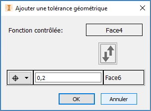 Sélectionnez Géométrique pour ouvrir la boîte de dialogue Ajouter une tolérance géométrique. Dans l'image suivante, l'élément Face1 contenu dans le champ de données supérieur est contrôlé par Face3 dans le tolérancement géométrique. Si ce n'est pas le cas, utilisez le contrôle