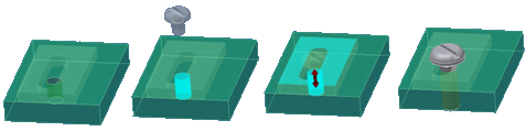 Immobilisez le curseur sur la face fraisée du perçage correspondant. Outre l'aperçu de la pièce, un point d'interrogation et une icône contextuelle s'affichent sur le curseur. L'icône indique le type de géométrie requise pour placer la pièce dans l'ensemble.