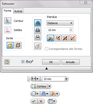 Les options disponibles dans ces mini-barres d'outils sont les mêmes que celles des boîtes de dialogue. Vous pouvez choisir d'afficher ou de masquer la mini-barre d'outils lorsque vous accédez à l'une des sept commandes suivantes : Extrusion, Révolution, Congé, Coque, Dépouille de face, Chanfrein et Liaison. Par défaut, les mini-barres d'outils ne sont pas affichées.