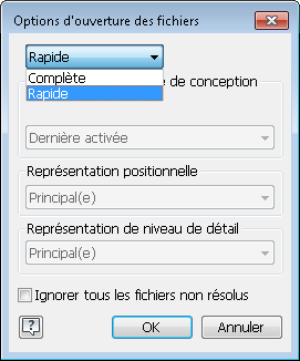 L'option Mode rapide doit être activée. Le cas échéant, deux options d'ouvertures s'offrent à vous : Chargement complet permet de charger toutes les données de composant et active toutes les commandes. Pour les ensembles de grande taille, cette opération peut avoir une incidence sur les performances et les délais d'exécution. Charger le mode rapide permet de charger uniquement les graphiques contenus dans le cache et exclut certaines commandes.