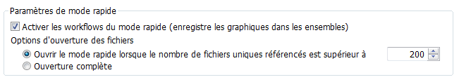 Lorsque vous activez le mode rapide et que vous enregistrez un ensemble, la valeur de seuil est utilisée pour lancer Charger le mode rapide lors de l'ouverture d'un ensemble qui dépasse la valeur de fichiers uniques. Lors de l'ouverture d'un ensemble, vous pouvez remplacer le comportement d'ouverture de fichier par défaut en utilisant l'une des méthodes suivantes :
