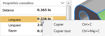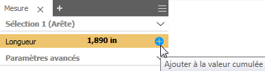 Effectuez autant de sélections que nécessaire dans la fenêtre graphique, puis cliquez sur le signe Plus situé à côté du type de mesure dans le groupe de fonctions Mesurer afin d'ajouter des valeurs à un groupe de valeurs cumulées. Les valeurs sont affichées dans le groupe de valeurs cumulées spécifique au type de mesure. Par exemple, un rayon est ajouté au groupe Distance et un angle est ajouté au groupe Angle, sous Propriétés cumulées.