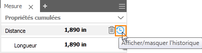 Pour ajouter une mesure linéaire, d'aire, de volume et/ou d'angle à la section Propriétés cumulées : effectuez une sélection dans la fenêtre graphique, puis cliquez sur le signe Plus situé à côté du type de mesure. Par exemple, sélectionnez une ligne dans la fenêtre graphique, puis cliquez sur le signe Plus situé à côté de la mesure. La valeur est ajoutée au groupe de mesures Distance, sous Propriétés cumulées. Cliquez sur Afficher/masquer l'historique à côté du paramètre Distance pour afficher la valeur que vous venez d'ajouter.