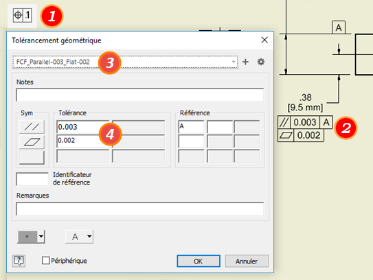 Conseil : Pour faire pivoter un symbole de tolérancement géométrique, cliquez sur le symbole avec le bouton droit de la souris, puis cliquez sur Rotation de 90° sens horaire ou sens trigonométrique.