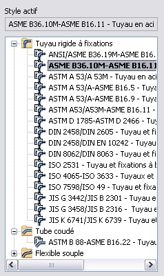 Lorsque vous ouvrez la boîte de dialogue Styles de tubes et de tuyaux pour la première fois, la liste du navigateur est automatiquement développée jusqu'à l'emplacement du style actif. Le style actif indiqué dépend de l'environnement de tube et tuyau actif. Ce style s'affiche au-dessus du navigateur de styles, dans une boîte de dialogue en lecture seule. Il s'affiche également en gras dans la liste du navigateur.