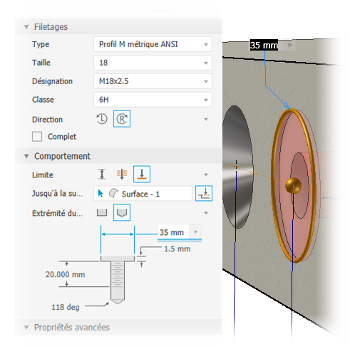 Placez rapidement des perçages à l'aide de valeurs prédéfinies ou spécifiez les cotes de perçage, l'extrémité du perçage, les limites et le type de filetage à l'aide du panneau des propriétés.