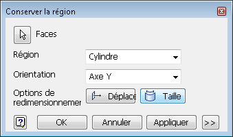 - Si besoin, développez la boîte de dialogue Conserver la région et modifiez le point de centre et les cotes de la région manuellement. Vous pouvez également ajuster l'orientation au niveau de la région du type de cylindre. Lorsque vous avez terminé, cliquez sur OK.