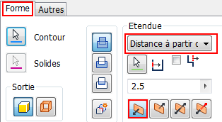 Dans l'onglet Forme, sélectionnez Distance à partir de la face et Direction 1 ou Direction 2, puis utilisez les options de l'onglet Autres pour obtenir des résultats différents.