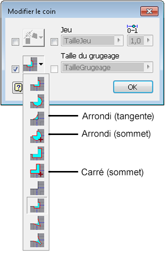 Les options Arrondie (tangente), Arrondi (sommet) et Carré (sommet) sont ajoutées aux grugeages en coin afin de proposer d'autres solutions de positionnement.