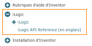 L'aide relative aux fonctions et aux arguments iLogic est désormais accessible depuis le noeud Référence de l'API iLogic. Le contenu de cette aide est disponible en anglais uniquement.