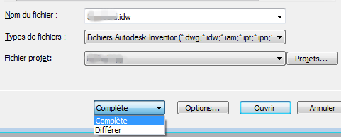 - Une zone de liste déroulante pour l'ouverture en mode complet ou différé est ajoutée entre les boutons Options...et Lancement rapide. L'option Différer réunit les actions des commandes Différer les mises à jours et Ouverture rapide. Elle permet d'ouvrir le document de dessin sans mettre à jour ou charger les documents de référence (les pièces, ensembles, etc.).