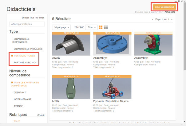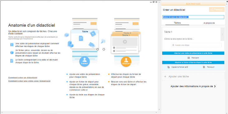 Vous pouvez désormais créer vos propres didacticiels et les partager de manière publique ou privée. Deux nouvelles catégories ont été ajoutées au type de didacticiel dans le cadre de cette amélioration. Cliquez sur Mes Didacticiels afin d'afficher et de gérer les didacticiels que vous avez créés. Cliquez sur Partagé avec moi pour afficher les didacticiels partagés de façon privée avec vous.