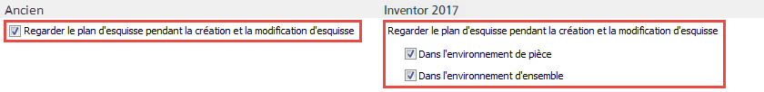 Maintenant que des paramètres distincts sont disponibles pour les esquisses de pièce et d'ensemble, vous pouvez, par exemple, désactiver l'examen du plan d'esquisse lors de la modification d'un composant et activer l'option Regarder lors de la modification d'une esquisse d'ensemble.