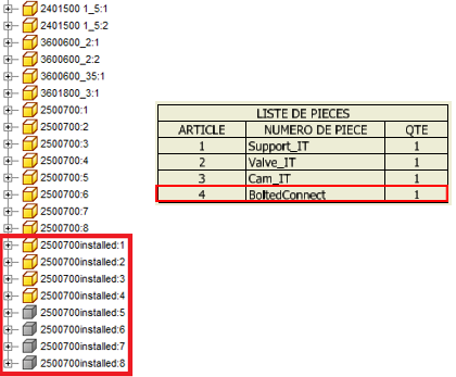 Lorsque la case Ajuster la quantité est cochée, la quantité d'une liste de pièces s'ajuste en fonction de la visibilité des éléments dans la vue de conception. Seules ces pièces visibles sont prises en compte pour les colonnes QTE et QTE d'articles dans une liste de pièces.
