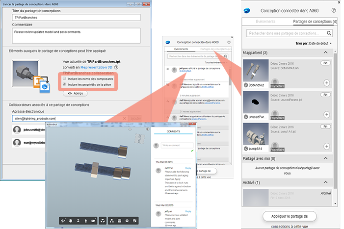 La fonctionnalité de partages de conceptions avait été ajoutée dans Inventor 2016 R3 pour faciliter les révisions des conceptions par les membres d'une équipe et par d'autres collaborateurs partout dans le monde, et depuis n'importe quel appareil. Plusieurs améliorations apportées à Inventor 2017 accélèrent et facilitent le processus de collaboration. Les collaborateurs et les commentaires peuvent désormais être vérifiés et gérés directement dans Inventor. De nouvelles options vous permettent de partager les propriétés et les noms des pièces, en plus des modèles de graphismes, pour effectuer des révisions plus détaillées.