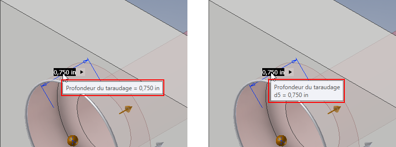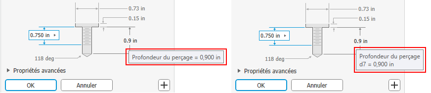 Pour la commande Perçage, lorsqu'une valeur est incorrecte, par exemple si la longueur de taraudage spécifiée est supérieure à la profondeur de perçage, la valeur s'affiche en rouge et l'info-bulle indique que cette valeur est incorrecte lors de sa saisie. Cela vous permet de corriger immédiatement la valeur ou de trouver une autre valeur à modifier pour que celle-ci devienne correcte. Les valeurs valides sont indiquées en noir.