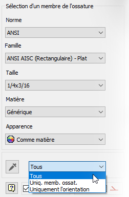 Vous pouvez désormais copier les informations de membres d'ossature existants lorsque vous utilisez les commandes de membre Insérer et Modifier. Dans la boîte de dialogue, sélectionnez la pipette afin d'activer l'option de copie des propriétés, puis sélectionnez un membre. Vous pouvez choisir de copier uniquement les informations sur le membre de l'ossature, uniquement l'orientation, ou les deux.