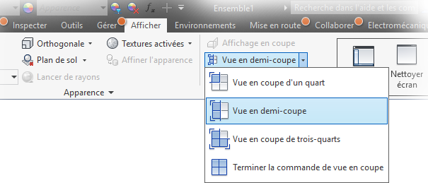 Lorsque vous installez Inventor, vous avez la possibilité d'accepter une activité de collecte des données. Sur la base de vos données d'utilisation Inventor, une vue en demi-coupe est utilisée dans la plupart des cas dans les modèles de pièces et d'ensemble. Par conséquent, grâce à cette mise à jour, la commande Vue en coupe est définie par défaut sur Vue en demi-coupe lors de sa première utilisation dans une session Inventor. Merci de nous aider à définir le paramètre approprié pour cet outil. La commande Vue en coupe est accessible à partir des onglets Afficher et Annoter dans les documents pièce et ensemble.