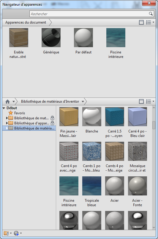 La bibliothèque d'apparences d'Autodesk installée avec un produit ou une suite fournit différents éléments d'apparences. Produits tels qu'AutoCAD, Inventor et Revit utilisent cette bibliothèque en lecture seule pour assurer un affichage plus uniforme des différents produits.