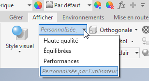 Lors de l'ouverture d'un modèle en mode rapide ou si vous utilisez ce mode, la valeur prédéfinie Haute qualité n'est pas disponible. En effet, ces composants ne sont pas entièrement chargés et le style visuel Réaliste n'est pas disponible.