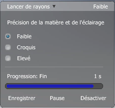 Si le processus de rendu avec lancement de rayons prend plus de 3 secondes, une barre de progression s'affiche dans l'angle inférieur droit de l'écran. Si vous cliquez sur la croix "X", le tracé de demi-droite est désactivé et la barre de progression est fermée.