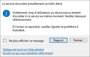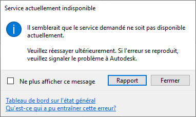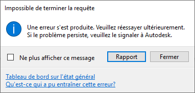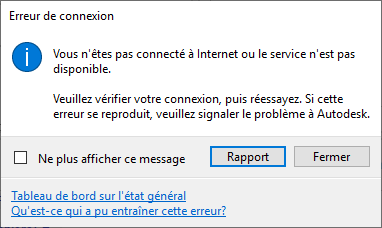 Si vous êtes connecté à Internet et que vous continuez de recevoir ce message d'erreur, cliquez sur le lien du tableau de bord sur l'état général, puis vérifiez l'état du service. Si le tableau de bord sur l'état général affiche que le service fonctionne correctement et que vous continuez de recevoir le message d'erreur, contactez l'assistance produit Autodesk. |