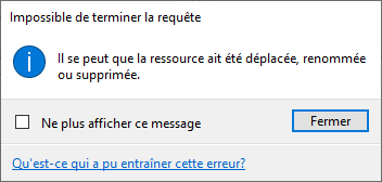 404, 410 | 1) Cliquez sur le bouton Fermer. 2) Actualisez l'emplacement du dossier du fichier. 3) Essayez d'accéder au fichier.