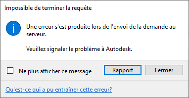 Lorsque vous travaillez en ligne, vous rencontrez un message d'erreur HTTP. Ce message est émis par l'un des services Web utilisé par Autodesk et vous avertit qu'il y a un problème. Dans la plupart des cas, ce problème provient de l'un des services Web d'Autodesk et vous aurez besoin de l'aide de l'assistance technique pour le résoudre. Les erreurs de ce type doivent être signalées au service d'assistance technique d'Autodesk. Dans certains cas, vous devrez entreprendre un certain nombre d'actions pour résoudre le problème.