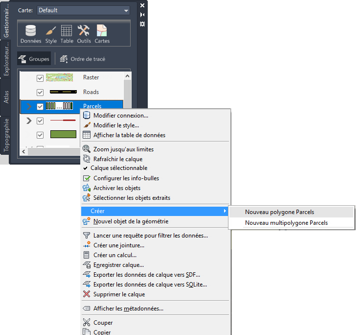 Chaque élément d'AutoCAD Map 3D toolset est associé à un menu personnalisé contenant des commandes disponibles pour cet élément à un moment donné.