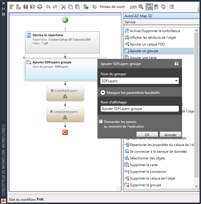 Dans cette leçon, vous allez modifier le workflow prédéfini qui crée des calques du Gestionnaire d'affichage à partir d'un dossier contenant des fichiers SDF et les enregistre dans des fichiers .layer. Vous allez créer un groupe et y déplacer les calques.