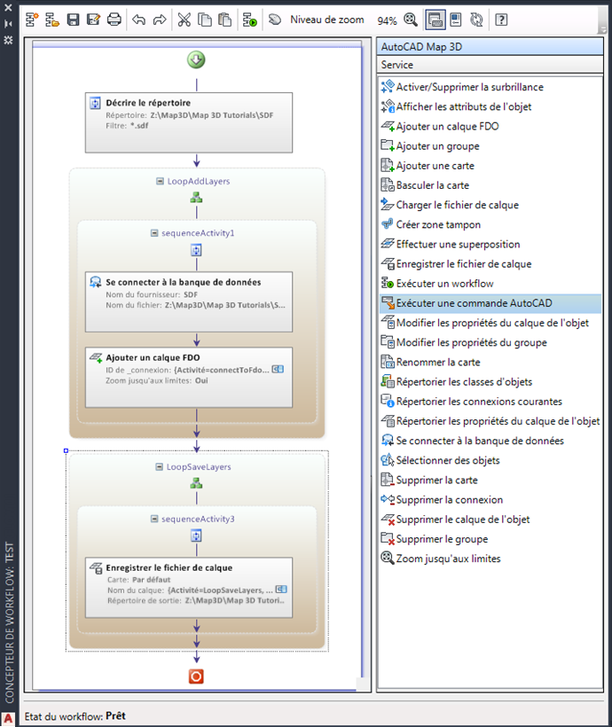 Dans notre exemple, l'activité ForEach a été renommée "LoopAddLayers" pour décrire les tâches qu'elle effectue. L'activité examine chaque fichier SDF du dossier désigné dans l'activité Exposer le contenu du répertoire. Pour chaque itération, elle se connecte à un fichier SDF et ajoute un calque d'objet au Gestionnaire d'affichage.