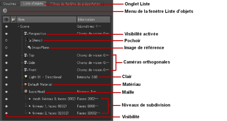 Elle affiche, par exemple, des maillages polygonaux, des caméras, des lumières, des matériaux, des courbes, des couches, des groupes et des jeux de sélection.