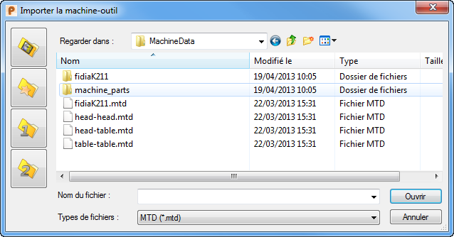 Cliquez sur l'onglet Machine-outil > panneau Fichier > Importer pour afficher tous les fichiers MTD existants :