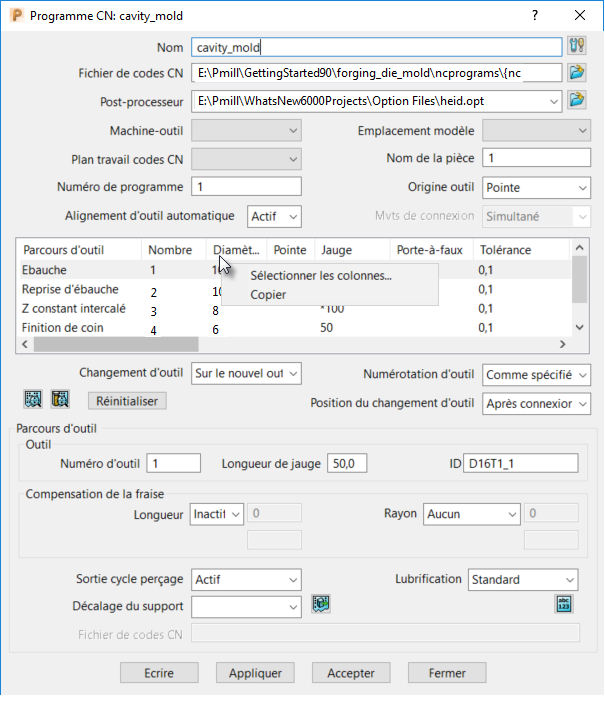 Pour personnaliser les vues de colonne dans les dialogues Programme CN ou Base de données d'outils:
