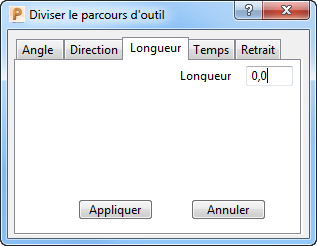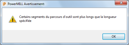 Si un ou plusieurs segments dans le parcours d'outil original sont plus longs que la Longueur spécifiée, certains parcours d'outils produits par l'opération de division dépassent également la Longueur. Dans ce cas, un message d'avertissement s'affiche: