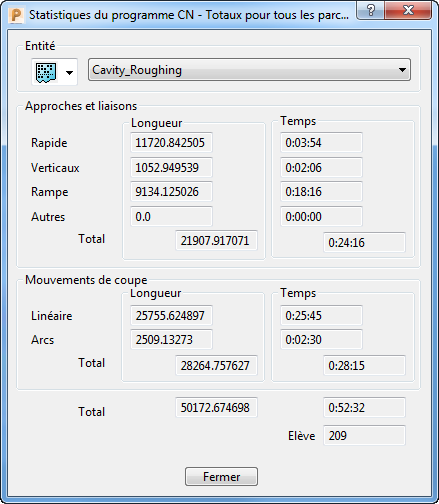 qui vous intéresse. Par défaut, le parcours d'outil sélectionné ou le programme CN est celui que vous avez utilisé pour afficher le dialogue, mais vous pouvez le changer.Changer une de ces options met à jour les statistiques automatiquement.