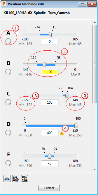 La valeur -90 est la position actuelle de l'axe. La ligne bleue et les valeurs -112 et -58 indiquent les points les plus éloignés où l'axe a été déplacé pendant la session de simulation actuelle.