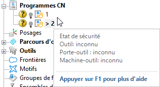 L'explorateur affiche les problèmes et les avertissements associés avec les programmes CN. Passer le curseur sur le programme CN pour afficher l'Etat de sécurité.