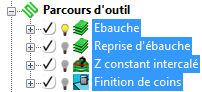 Pour voir les effets de vos changements, sélectionner un des parcours d'outils, sélectionner un des parcours d'outils, et étendre l'entité Avances et vitesses dans la fenêtre d'explorateur.