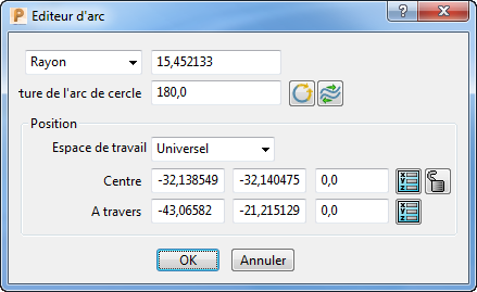 Utiliser le dialogue Editeur d'arc pour éditer un arc ou un cercle. Pour afficher le dialogue Editeur d'arc, faire un double-clic sur un arc lorsque l'onglet Editeur de courbe s'affiche.