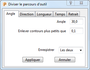 - Angle — Cet onglet divise un parcours d'outil en deux parties selon l'angle que chaque mouvement fait avec le plan XY. L'angle est dépendant de la direction d'usinage.