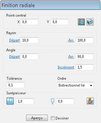 Utiliser la stratégie Finition radiale pour créer un motif radial 2D dans une frontière, puis le projette sur le modèle. Le motif est ensuite usiné.