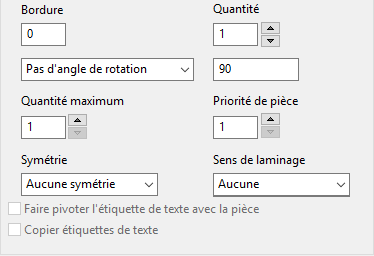 Faire pivoter l'étiquette de texte avec la pièce — Quand vous dupliquez des pièces, PowerShape pivote les pièces pour les ajuster dans la feuille. Sélectionnez cette option pour également faire pivoter toute étiquette de texte contenue dans les pièces pivotées.