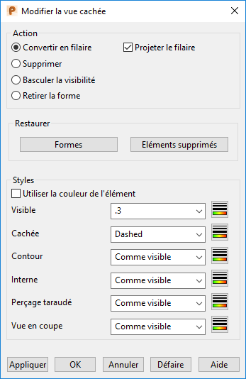 Utilisez cette boite de dialogue pour éditer les lignes cachées et visibles. Vous pouvez également manipuler le modèle dans la vue sélectionnée en utilisant le bouton du milieu de la souris quand cette boite de dialogue est affichée.