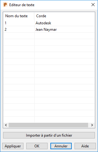 Modifier le texte — Sélectionnez cette option pour afficher la boite de dialogue Editeur de texte. Cela contient les noms de texte et les lignes inclus dans le dessin.