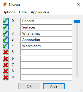 Utilisez cette boite de dialogue pour nommer et afficher les niveaux.