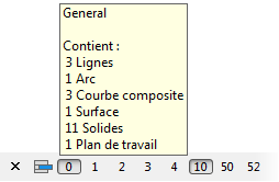 Vous pouvez assigner des éléments à différents niveaux de dessin et les activer ou les désactiver, en utilisant les boutons sur la barre d'outils de niveaux, qui est affichée par défaut en-dessous de la fenêtre de modélisation. La barre d'outils affiche un bouton pour chaque niveau qui est nommé ou en utilisation.
